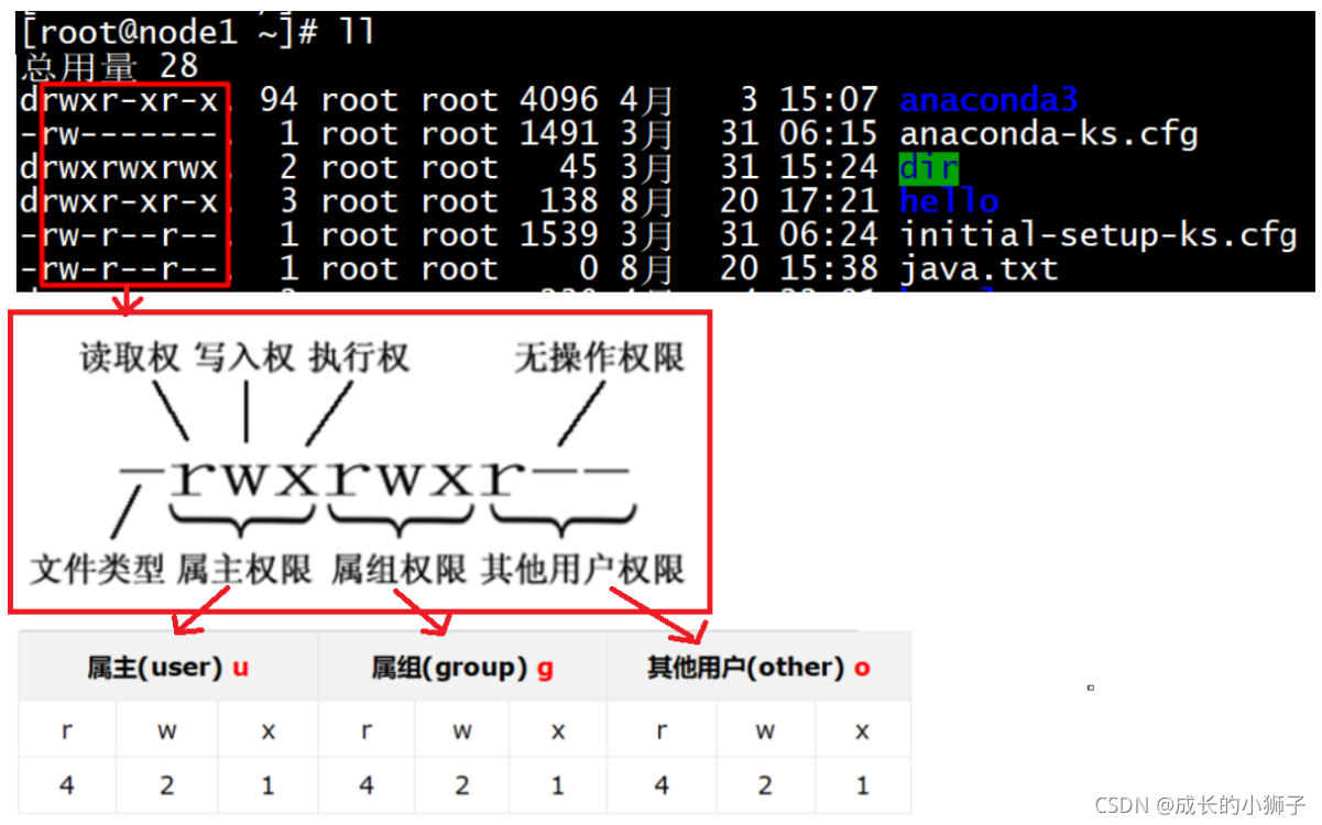 ls -l 或 ll 可以查看文件夹下文件的详细信息,详细信息从左到右 依次是