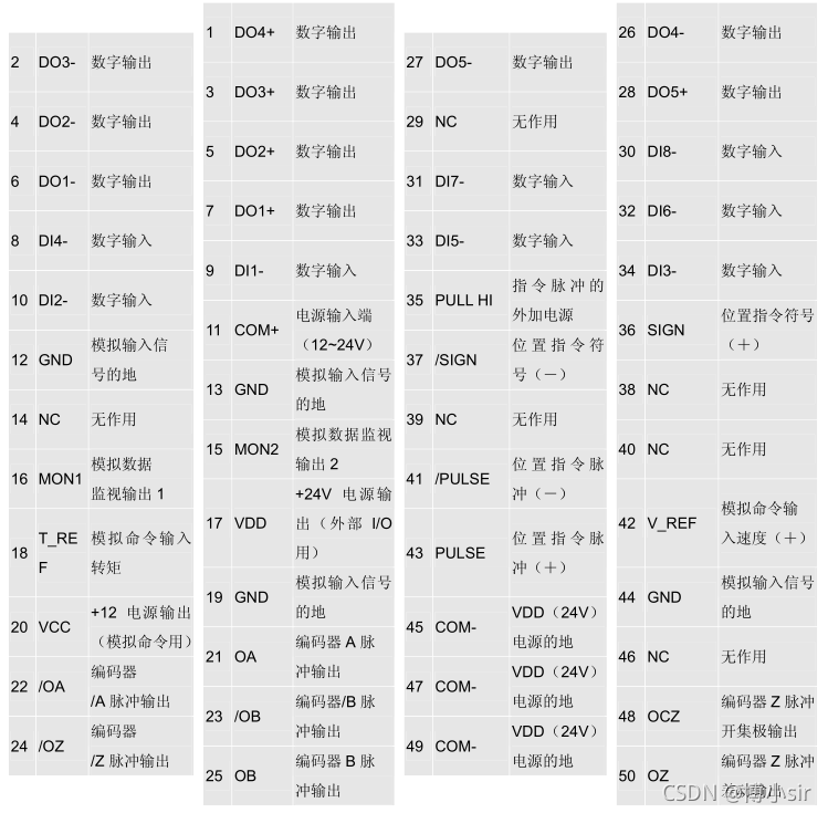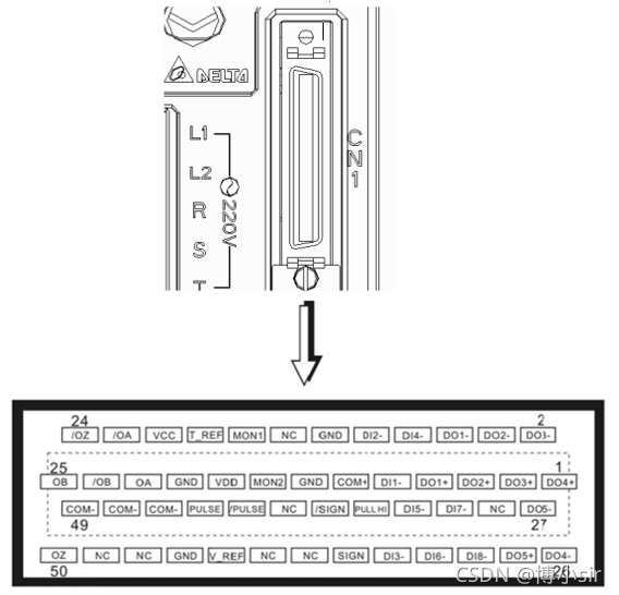 台达驱动器的用户手册提供了CN1端子的管脚定义,如图5、图6所示。