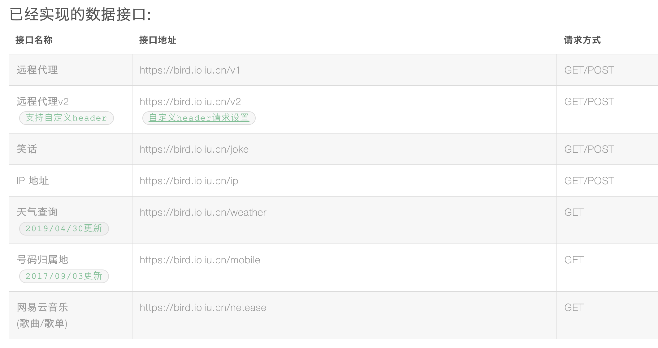 要解决跨域问题,其中一种方式便是使用远程数据接口代理,这里我使用jsonbird网站进行代理,这个网站有多种数据接口,这次便使用v2这一接口进行数据请求: