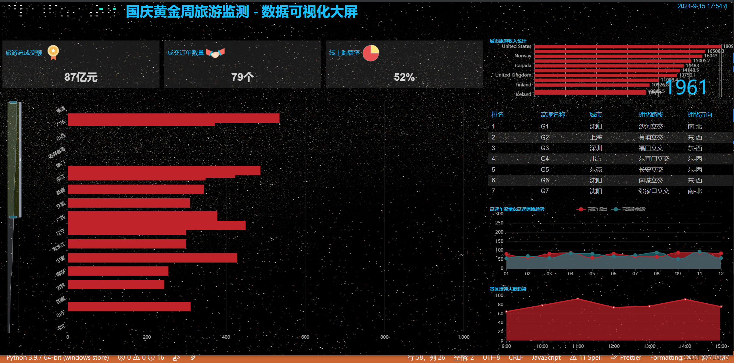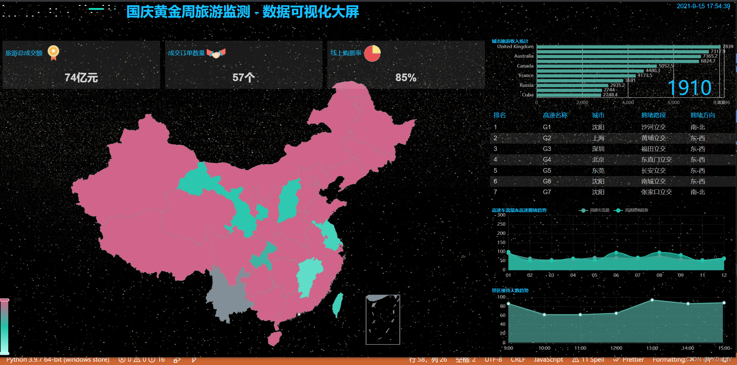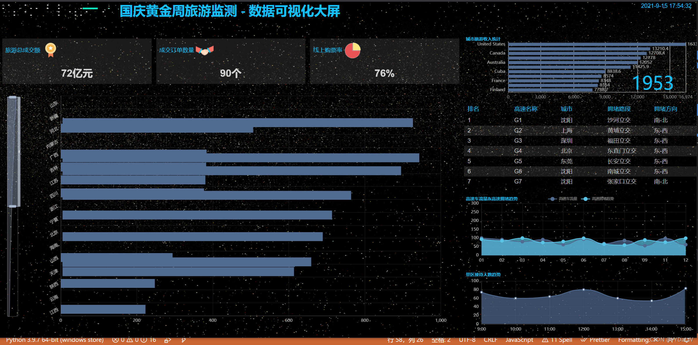 马上就要国庆黄金周了,小伙伴们是不是已经热血沸腾筹谋着去哪里玩一玩嗨一嗨,作为程序猿的我,脚步虽然还没走出去,但是 “酷炫吊炸天” 的霸道总裁大屏驾驶舱必须双手奉上,供大家参考交流。今天为大家分享的是 【国庆黄金周旅游监测 - 数据可视化大屏解决方案】。