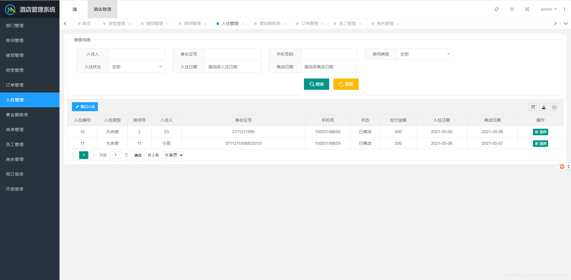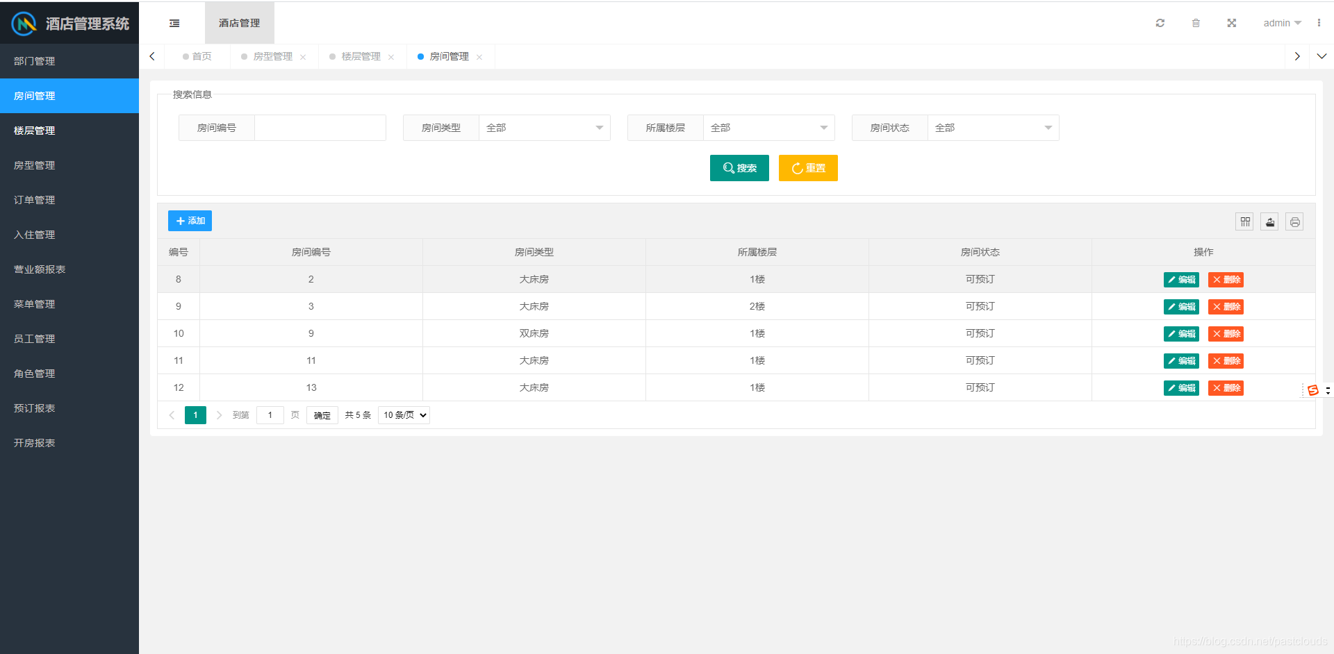 功能包括(管理员和用户角色): 酒店预订,酒店管理,员工管理,入住原理,订单管理, 楼层管理,退房管理,营业额报表等等。