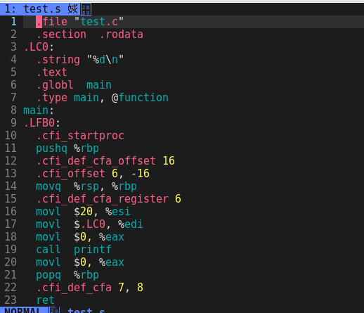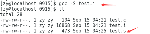 在linux下采用gcc -S将test.i文件编译生成test.s文件