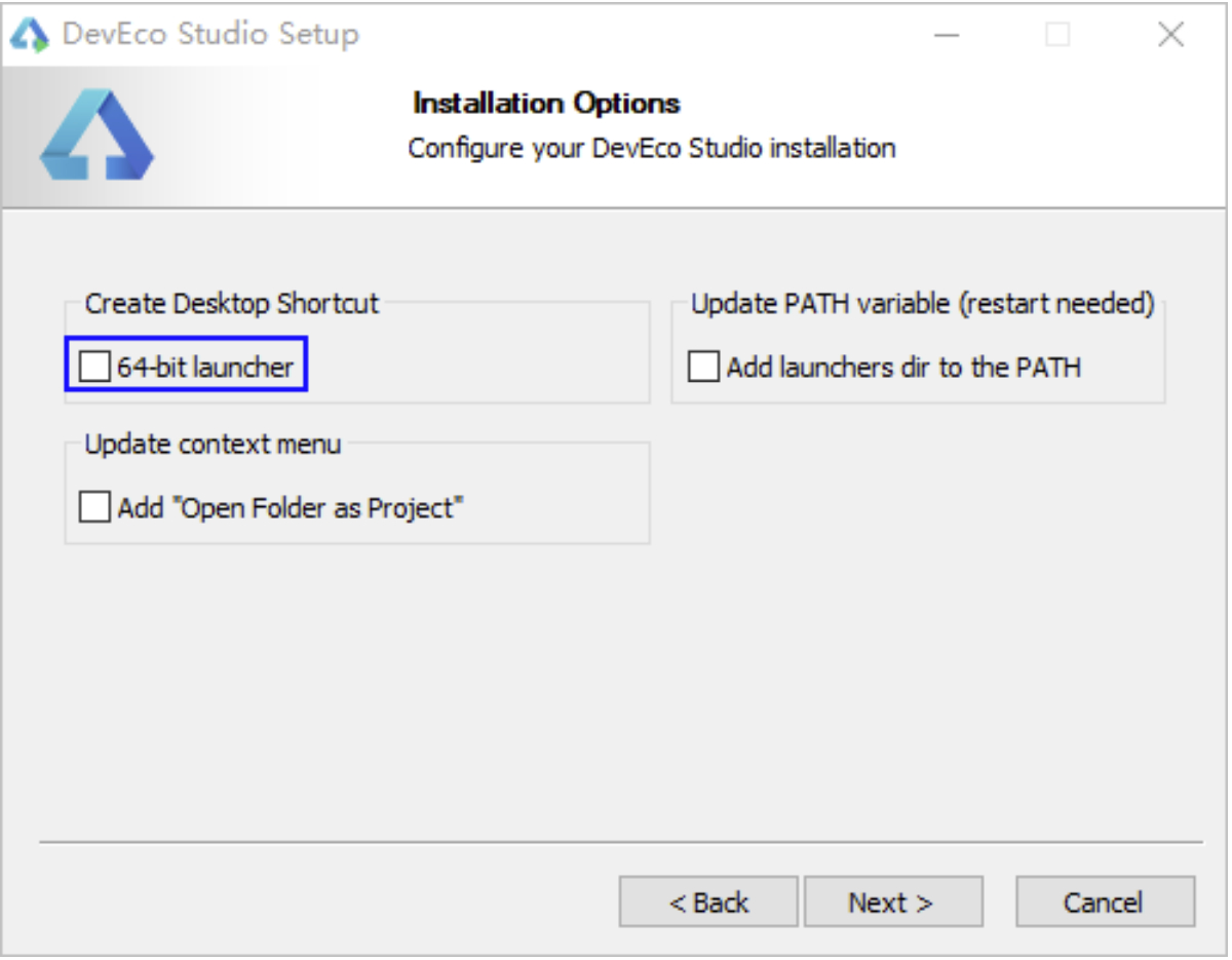 3.双击下载的“deveco-studio-xxxx.exe”,进入 DevEco Studio 安装向导,在如下安装 选项界面勾选 64-bit launcher 后,点击 Next,直至安装完成。