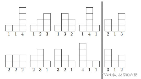所以可以设定为dp [ i ][ j ]的状态为 最下层为 i ,上层摆放 j 个积木并且不组成凹槽的数量。由于每次底座上方的次层数量不固定,摆放方式也不固定,例如 S 的底座上方一个积木有 S个摆放方法,所以可以得到如下的 dp 转移方程: