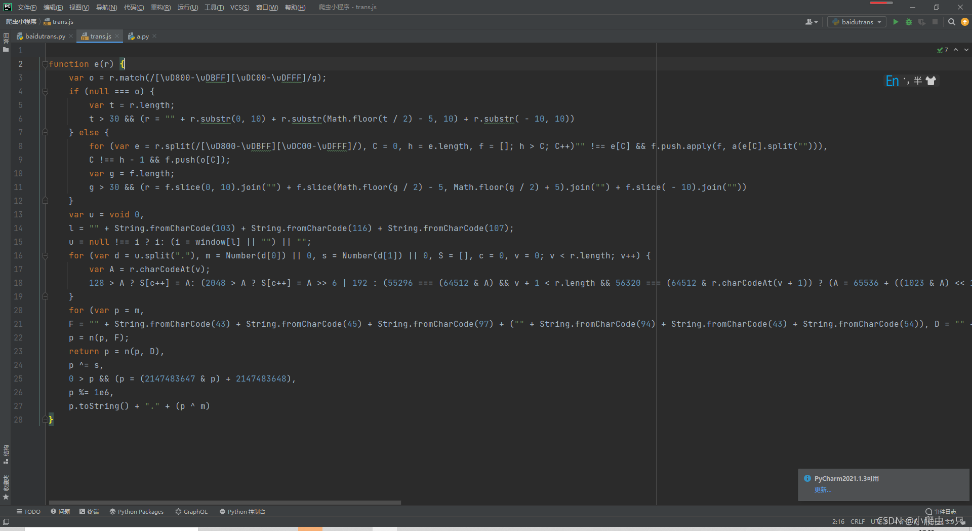 sign的参数,我们将这段JS代码复制下来,打开pycharm写进一个创建好的trans.js文件里
