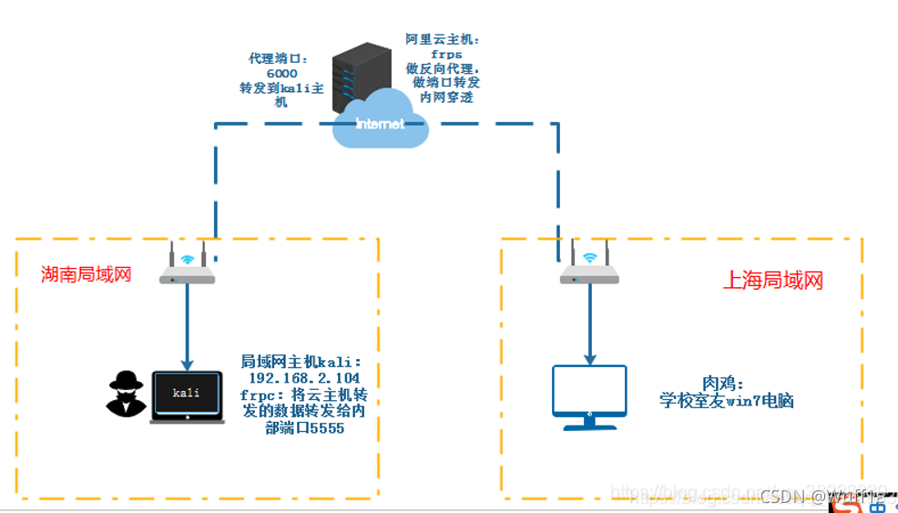 黑客在湖南局域网,肉鸡在上海局域网,你用的是自己内网里面的虚拟机kali生成的后门,你想实现控制上海的肉鸡。