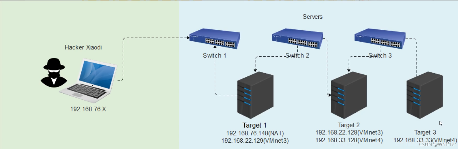 1主机在内网1,2主机在内网2.就好比说你在学校宿舍上网,我在网吧上网,我们都属于内网,但是我们不是一个内网,您是学校内网,我是网吧内网,这两个网络如果要实现通信。比如我现在有个后门CS或者MSF生成一个后门发给你,你去执行这个后门,这个时候如果你能让对方上线到你这是上线不了的,因为你们都是内网,除非这个时候采用一些代理技术。你用CS想控制这台内网主机,你CS在另外一个内网,受害主机在一个内网,那么上线是不可能的。必须要借助代理