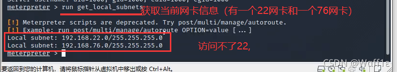 获取网络接口:run get_local_subnets(因为在实战情况下是不知道这台主机是什么网络的,前面是因为看了拓扑图,这个就是获取网卡信息,确保下面有没有内网)