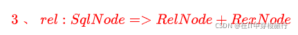 rel阶段是将SqlNode组成的一棵抽象语法树转化为一棵由RelNode和RexNode组成的关系代数树,或者称为执行计划。RelNode表示关系表达式,如投影(Project),即SELECT,和连接(JOIN)等;