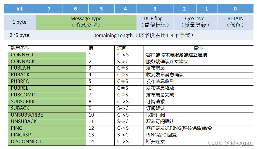 RETAIN: 保留标志位,如果为1,服务器存储最新一条RETAIN消息,以便分发给新的订阅者;