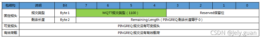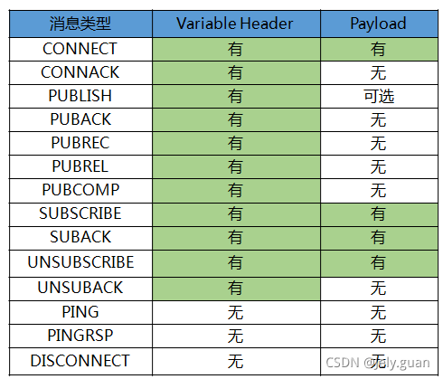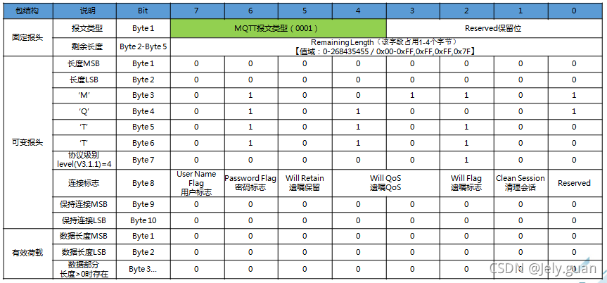 在MQTT协议中,一个MQTT数据包由:固定头(Fixed header)、可变头(Variable header)、消息体(Payload)三部分构成。MQTT数据包结构如下: