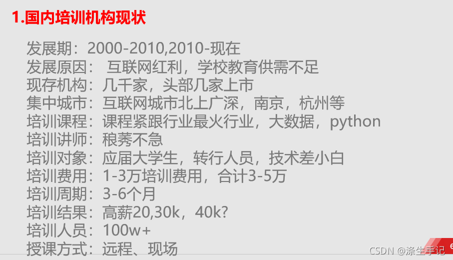其四,培训既有很多线下的全日制教学的,也有线上培训的 ,如果有工作的下伙伴,我个人觉得没必须去线下全日制,还那么贵,当然如果约束管理能力特别差,有时间的建议线下学习,效果会好些。当然如果准备跨行的有工作的建议可以课后学下,每天学习一点,这样两不耽误。