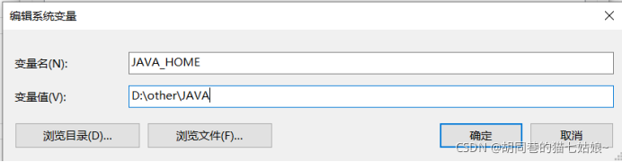 变量值:浏览目录,将刚刚我们解压到的文件点击,不用到它的子目录了,我这里设置的是JAVA文件夹,看你们自己设置的是什么名臣,再按下确定