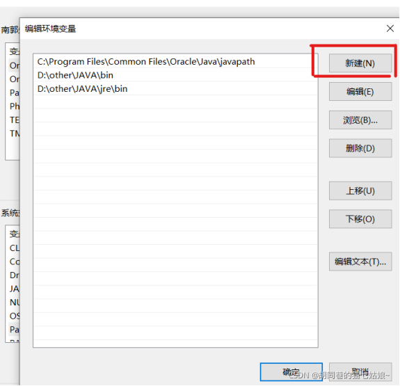 添加的两个分别是D:\other\JAVA\bin 和 D:\other\JAVA\jre\bin 添加完成后一路按确定一直确定到退出,这个是根据自己的文件夹位置写的,博客园和CSDN上有许多关于这两个环境名称的不同书写方式包括可能会引起的错误,如果在接下来的验证中环境没有设置正确可以自己再去搜索一下怎么设置