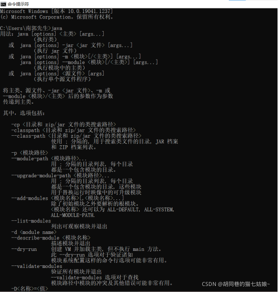输入java,点击回车,如果出现以下显示就证明java环境已经装好了