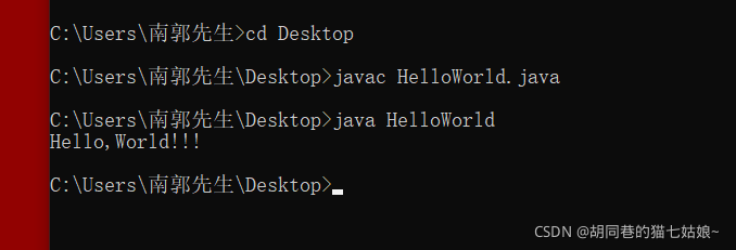 这里因为我的文件是直接新建在桌面上的,所以cd 之后是接Desktop(桌面),如果你们的是放在盘中直接把文件路径复制粘贴过来放cd空格后就好了,注意HelloWorld是我的文件名称,如果你的文件名称是test,第二行就是javac test.java,同样第三行就是java 文件名,最后回车看能不能输出,用命令行跑JAVA文件很慢,而且编译语言也不好写,所以现在需要下个ECLEPSE