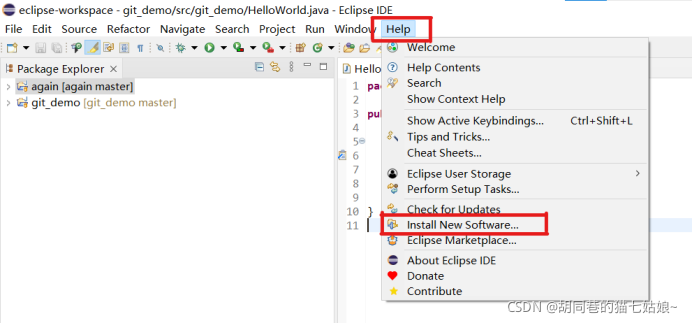 进入到Eclipse界面,点击菜单栏中的Help,再点击Install....