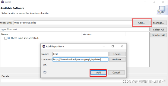 之后点击Add,随后连续下一步默认安装就可以,安装后进行重启!进行重启!进行重启!(重要的事说仨遍)重启Eclipse