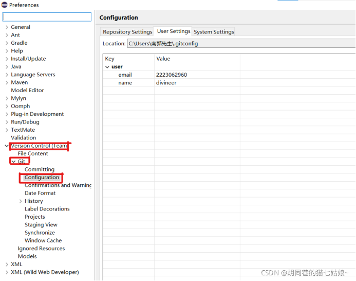 为了方便操作,将弹窗扩大,找到Version Control(Team)->Git->Configursation目录,找不到的uu也可以直接搜,然后右侧就会有你Github上的用户名与邮箱