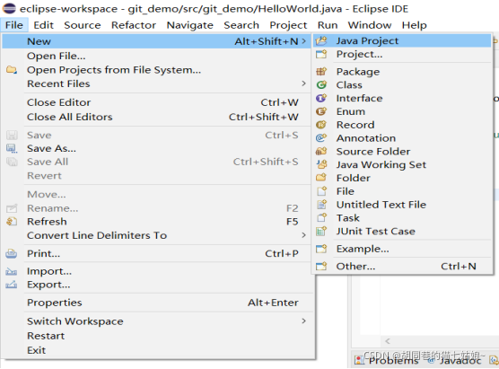 第三步,就是建立一个测试的文件首次上传到GITHUB中可不可以了,该步骤就是要新建项目并先保存到本地的GIT仓库中 我们点击右侧那个新建文件或者菜单栏中File新建一个Java project