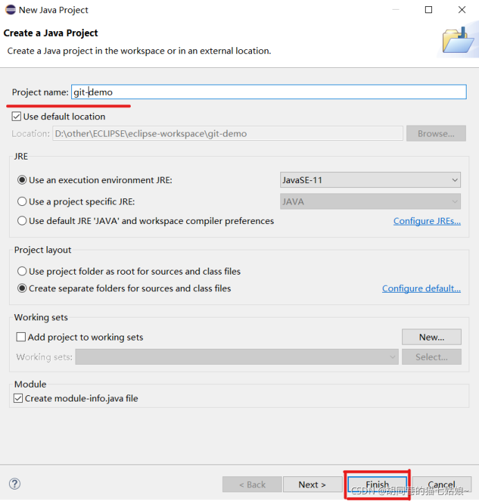 出来以下的弹窗,直接命名一个文件夹git_demo,检查以下JDK是否与当前版本相合,再直接Finish即可