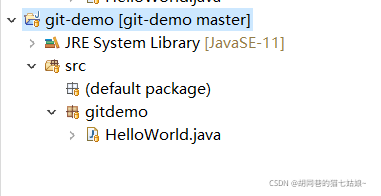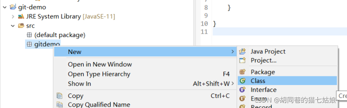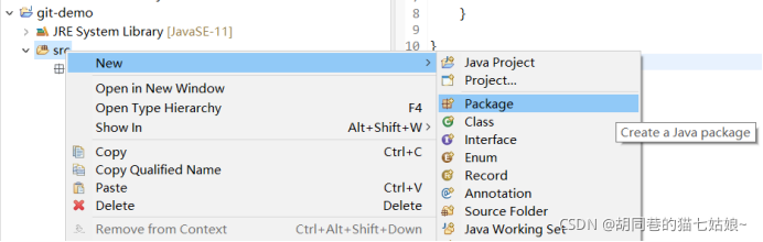 创建好了这样一个项目之后,我们建一个HelloWorld的类(名字当然随你取)首先右击git-demo文件夹下src文件夹,选择Package