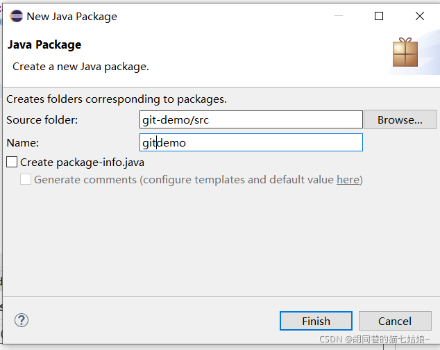 出现如下界面,我们随便取一个包的名字(这个在以后的公司中应该有规定,前面以com开头中间为名称后面为用途,这里我们只是测试一下,都随意)后,点击Finish创建这个包在src目录下