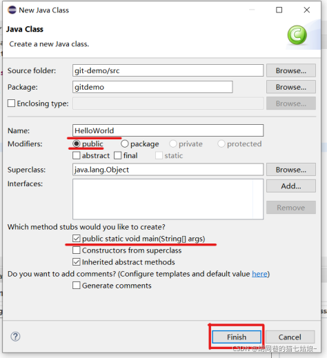 我们命名这个类的名字后确定public按键,以及选择下方红线标红的那个选项,最后点击Finish成功创建这个类,此时右边的代码区也会出现一定的代码,甭管他