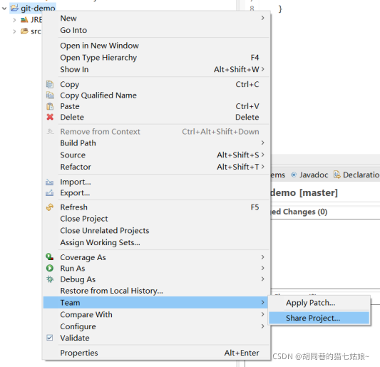 类别创建好了之后就是要保存到本地仓库,接下来是将代码文件保存到本地仓库的操作,首先我们右击那个最大的新建的git-demo文件夹,按照以下操作单击 Team->Share project...