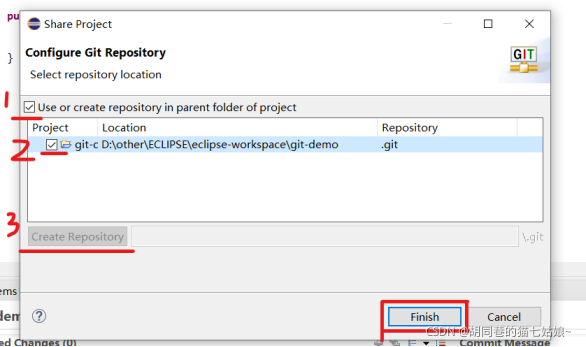 之后依次单击这三个按钮,然后点击Finish就创建本地仓库了(我这个已经按完了的界面和开始界面有些不同,依次按下这三个按钮即可)
