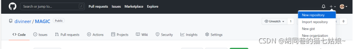 现在保存到本地仓库的操作完成之后,我们就需要准备上传到GITHUB我们自己账号的仓库了,准备工作有在GITHUB上建立一个我们自己的库,步骤如下,首先点击这个网页右上角的加号,在点击New repository(登录我们自己的账户状态下新建仓库)