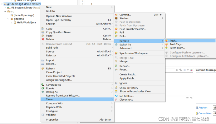 按照图片上点击右大的git-demo文件夹,Team->Remote->Push...