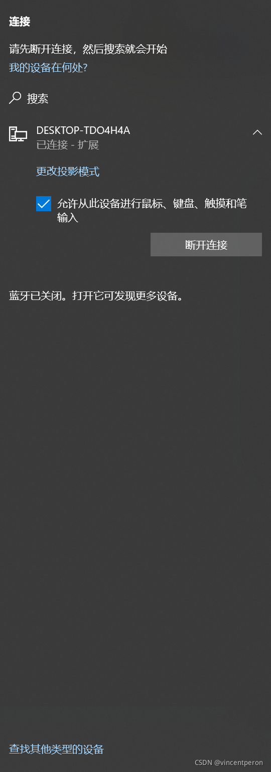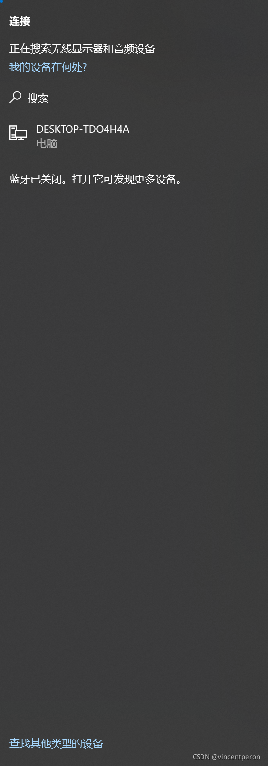 我的情况:两台Windows10主机;主机连了无线网络,显示器机器没有连无线网(之前一直连了但是主机能搜到但投影不了),不用连接蓝牙