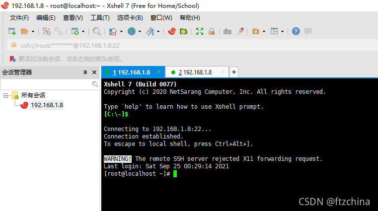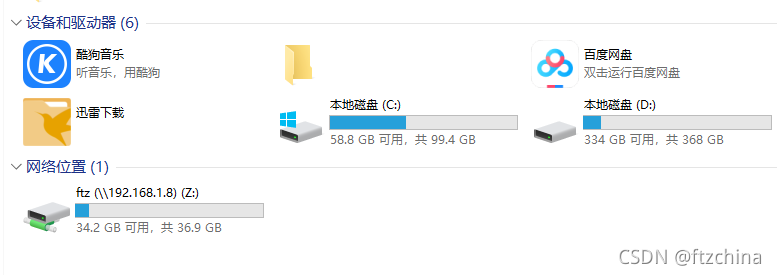 还有一点我们如果想往Linux里面传文件或者从Linux读文件怎么办呢,很简单开启samba服务,在windows上共享Linux文件,具体设置可以去查阅相关资料,下面ftz盘是我共享出来的samba文件夹建立的一个映射快捷方式。