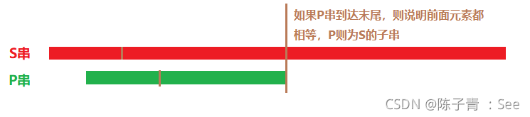 if(j==n) //当j==n时则说明 P串最后一个字符已经和S串匹配,则P为S的字串