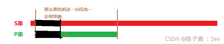 假设黑色部分不相等, 也就是 以 i点为结尾的头串 不等于 以 j点末串 ,显然这一次也不能匹配成功!那么就需要从S串的下下个位置开始比较。那如果 以 i点为结尾的头串 等于 以 j点末串 呢?