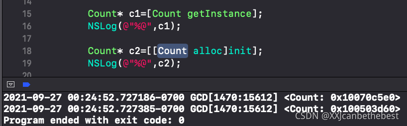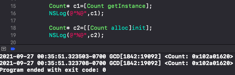 首先声明一个全局的Count类对象_instance,作为单例。 类方法中使用了GCD中的dispatch_once方法,这里涉及到了多线程,使用 dispatch_once 方法能保证某段代码在程序运行过程中只被执行 1 次,并且即使在多线程的环境下,dispatch_once 也可以保证线程安全。
