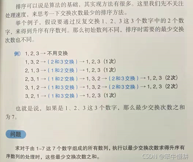 考虑:N个数字的每种排列看作是一个节点,邻节点是指能通过交换任意两个位置的数得到的新的排列。这样,所有N!个排列一个连通图。能以最少交换次数到达升序有序排列(记为B)的数列(记为A)就等价于从A代表的节点在这张图中到达B对应的节点的最短路径长度。