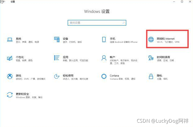 或者按快捷键“WIN+I”,打开Windows设置,点击网络和Internet,进入网络和共享中心。