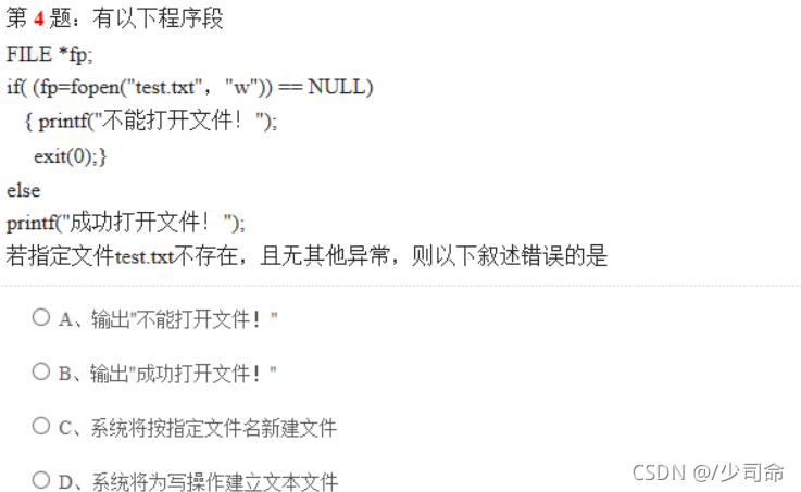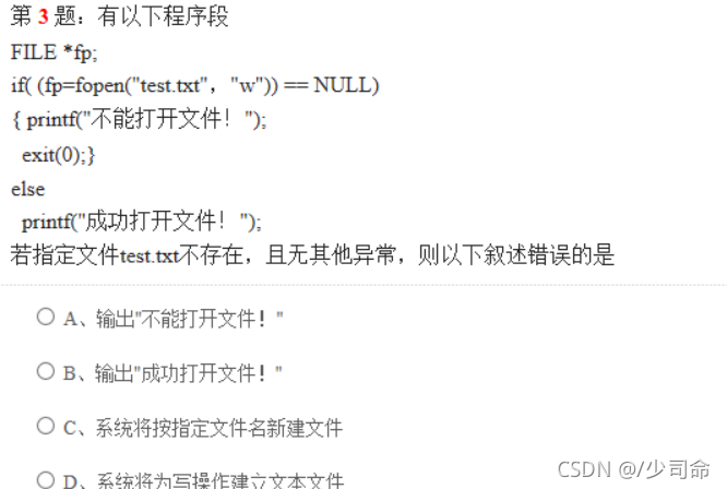参考解析∶【解析】fopen函赛数以一定方式打开指定文件,返回一个指向文件的文件指针,如果不能实现打开指定文件的操作,则返回一个空指针NULL。如果指定文件不存在则创建一个文件名为指定文件名的新文件,然后打开它。在指定文件有错误或者指定文件不存在却不能创建新文件的情况下,打开文件操作错误,返回空指针。本题程序中,文件test.txt不存在,但无其他异常,表示可以建立新文件,命名为test.txt,C洗项叙述正确,并以只写方式打开它,D选项叙述正确,返回指向灾件的指钎,if条件不成立,输出“成功打开文件!”,B选项叙述正确,A选项叙述错误。所以选择A选项。
