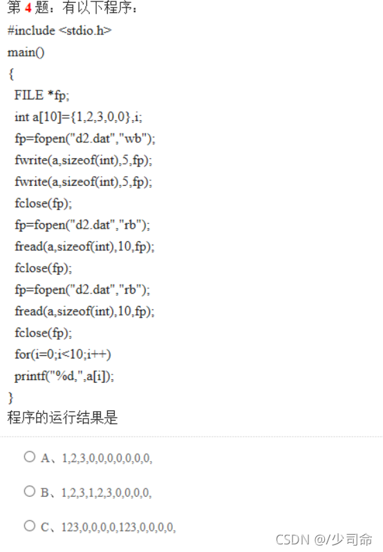 参考解析:【解析】本题考查文件操作函数,两次fwrite后,p文件中已经写入1.2,3,0,0.1.2,3.0.0然后将文件p中的内容重新写入数组a中,最后输出a为1,2,3,0,0,1,2,3,0,0,所以选项D正确。