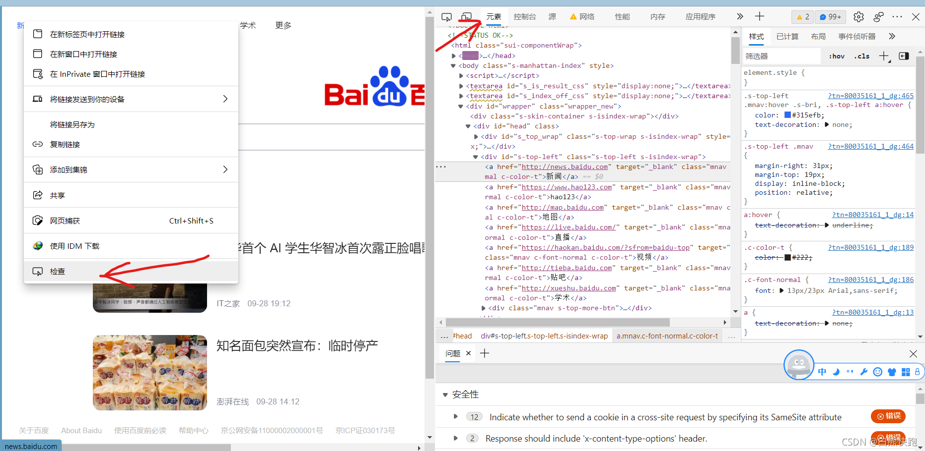 - 首先需要的是开发者工具,有的同学可以直接按F12调出,有的需要手动按一按。我们需要点击右边的“元素”,然后在页面中选择一个元素右键点击“检查”,就可以找到对应的代码。