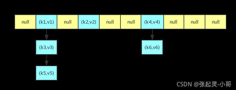 HashMap 的大致结构如下图所示,其中哈希表是一个数组,我们经常把数组中的每一个节点称为一个桶,哈希表中的每个节点都用来存储一个键值对。在插入元素时,如果发生冲突(即多个键值对映射到同一个桶上)的话,就会通过链表的形式来解决冲突。因为一个桶上可能存在多个键值对,所以在查找的时候,会先通过 key 的哈希值先定位到桶,再遍历桶上的所有键值对,找出 key 相等的键值对,从而来获取 value。