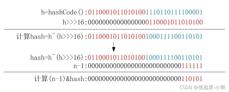 为啥要这样做呢?注释中是这样解释的:如果当 n 很小,假设为 64 的话,那么 n-1 即为 63(0x111111),这样的值跟 hashCode()直接做与操作,实际上只使用了哈希值的后 6 位。如果当哈希值的高位变化很大,低位变化很小,这样就很容易造成冲突了,所以这里把高低位都利用起来,从而解决了这个问题。
