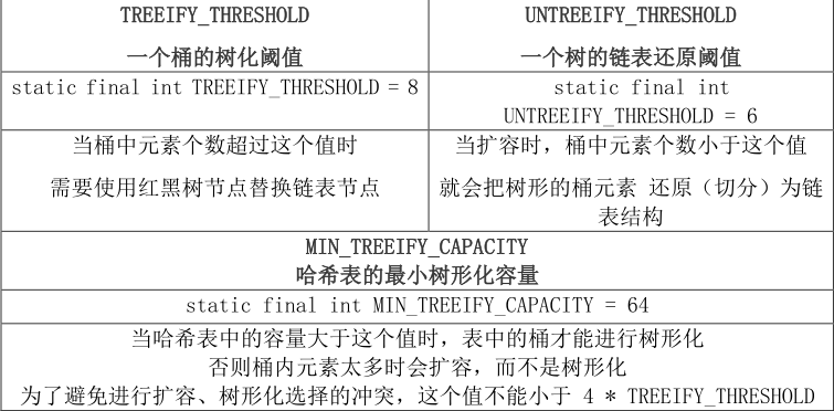 - 如果HashMap集合中某个桶中的结点数超过了8,则单向链表结点会被替换成红黑树结点;当桶中的结点数小于6时,会将树形结点转回单向链表结点。只有当哈希表中的元素数量超过64时,才会进行树形化(即转换成红黑树这种结构)。否则只是进行扩容。