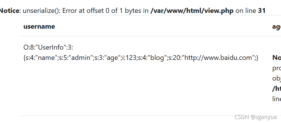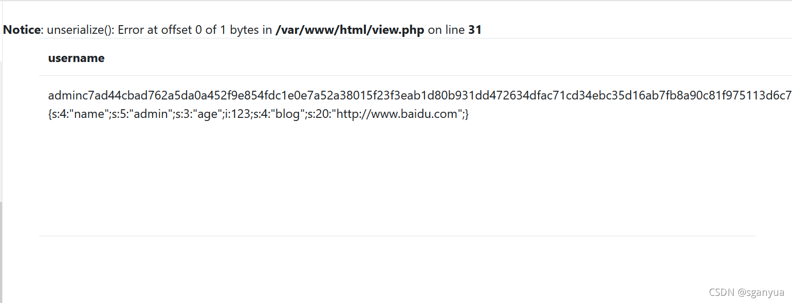 是个序列化后的UserInfo对象,下意识想起之前那份备份文件也定义的类为UserInfo,最开始时的用户界面为no=1时,靶场根据users表查询no=1进行渲染的页面。可以猜测,和数据库表中的字段no,username,passwd,data顺序相似,第四个字段应该就是data。思考一下,一共有4个字段,select的时候如果将第四个字段插入data序列化后的内容,是否就回显了我们注册的admin用户和他的blog呢?