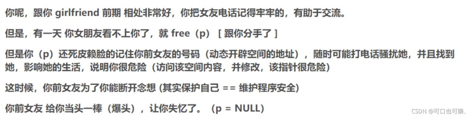 而如果它在程序中没有被free就被指向另一块地址了(或者该被被销毁),那么就会导致这块地址在这个进程中永远无法被找到(即内存泄露:无用的内存越来越大,操作系统得一直给这个进程分配内存)