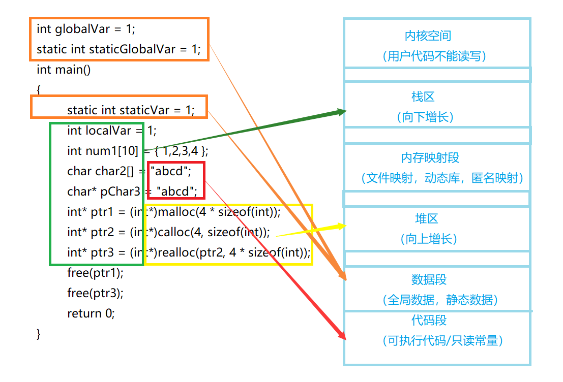 - 数据段(静态区)(static)存放全局变量、静态数据(程序结束后由系统释放)